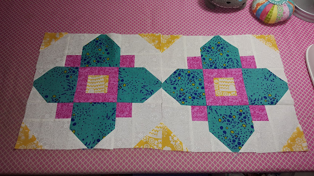 Now that that's out of my system I needed to get to quilting this month. I was able to finish my bee blocks the last day of February as they got posted early and I was hive queen in my other hive. Jenna requested Quarterfoil blocks in teal, pink and yellow -- remember the only fabric i bought last month, yeah it was intended for these beauties. My teal was a little light that I got but I did have some in the stash that was dark enough. (-1 yd)